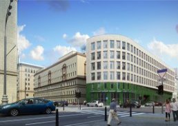 Комплекс выполнен из натурального камня (оттенок «слоновая кость»). Цокольные этажи декорированы гранитом изумрудного цвета. Генеральным подрядчиком проекта является строительный концерн «ФОДД». Специалисты предприятия смонтировали 18,5 тыс. кв. м фасада. На данный момент новостройка готова на 98%.